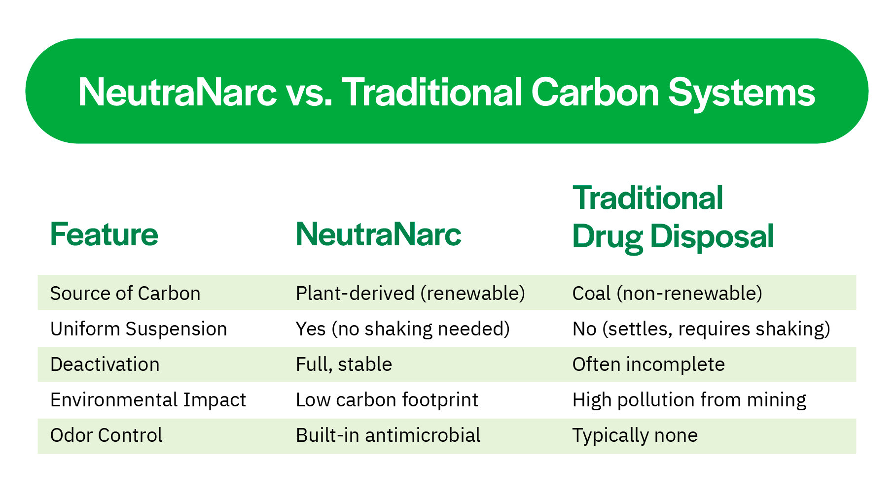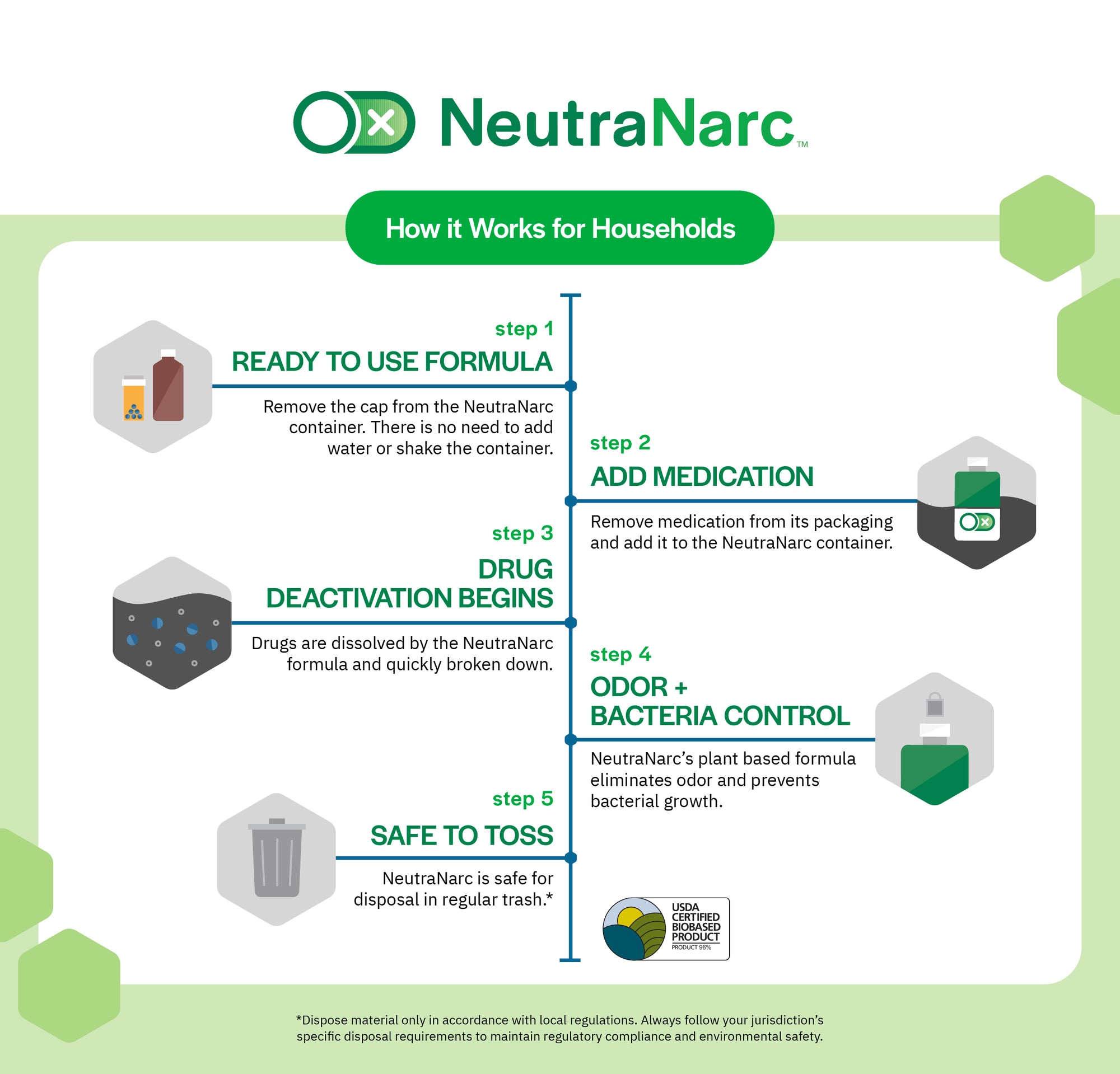 Pharmaceutical waste is increasingly found in drinking water and surface water supplies, leading to environmental and public health concerns. Unlike flushing or traditional disposal methods, NeutraNarc’s biodegradable formula prevents medications from entering water systems, protecting wildlife, aquatic ecosystems, and human health.