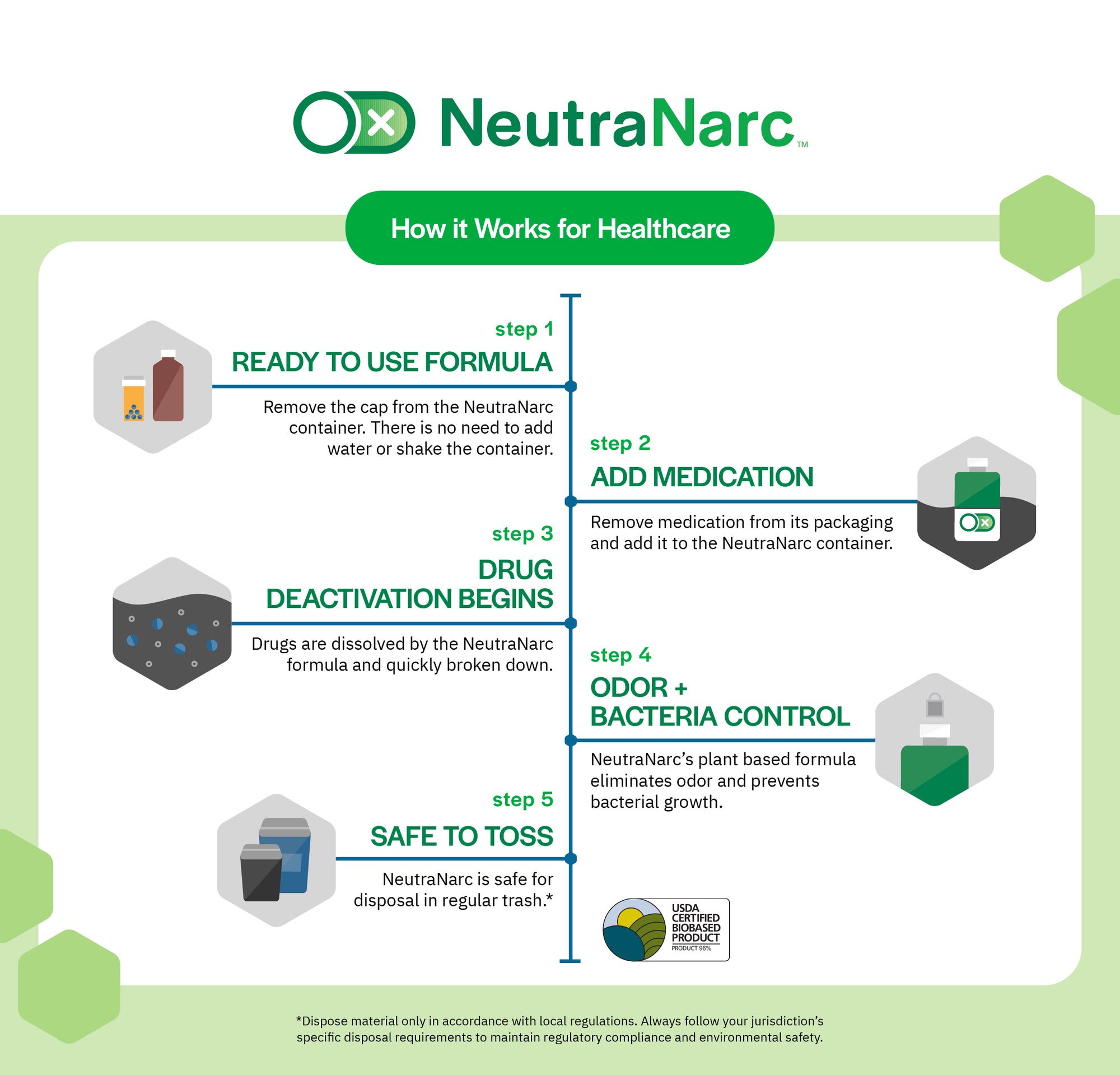 Pharmaceutical waste is increasingly found in drinking water and surface water supplies, leading to environmental and public health concerns. Unlike flushing or traditional disposal methods, NeutraNarc’s biodegradable formula prevents medications from entering water systems, protecting wildlife, aquatic ecosystems, and human health.